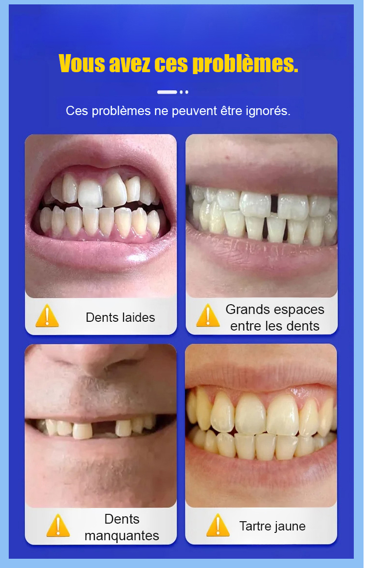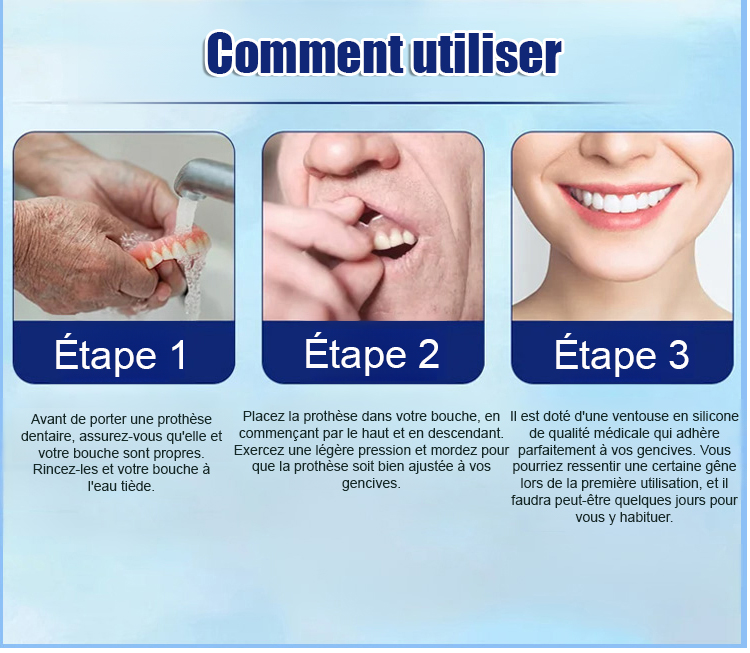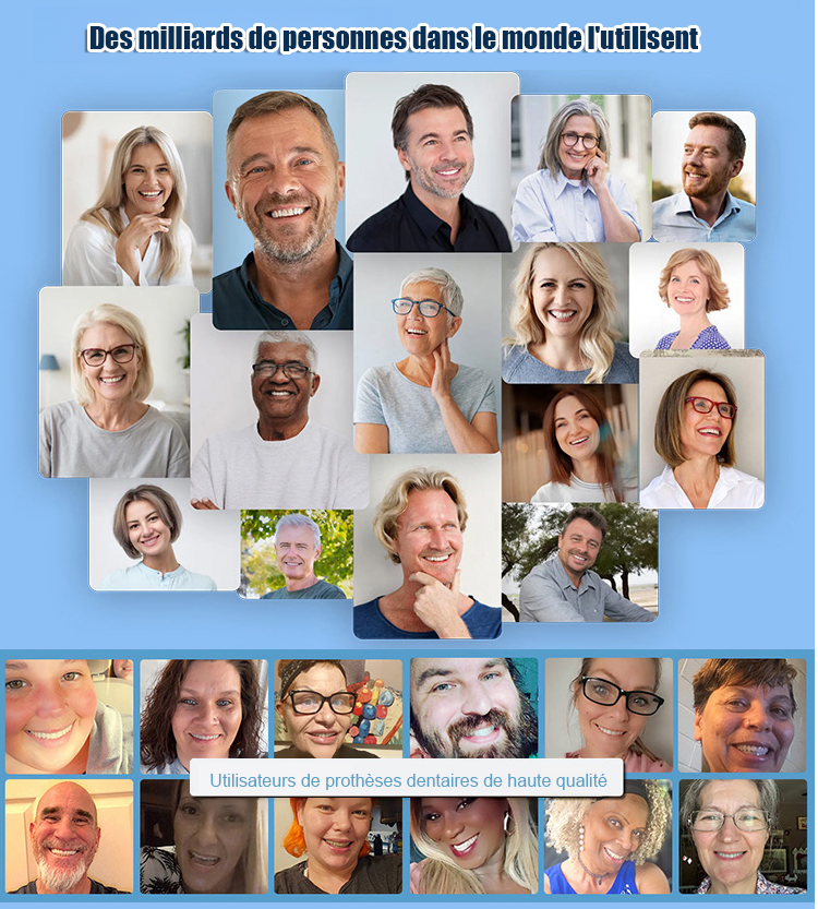 S'adapte parfaitement à votre bouche. Que vous ayez une dentition complète, des espaces partiels ou une édentation complète. Pas d'adhésif, pas de dentiste, pas de rendez-vous.